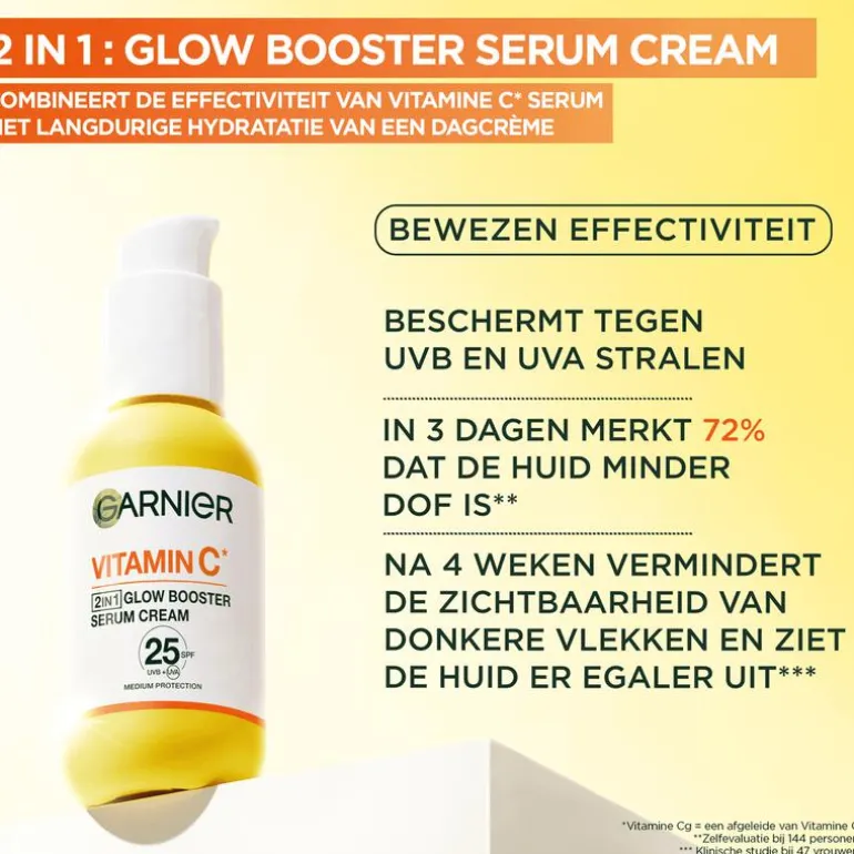 Garnier SkinActive Serum Cream met Vitamine C* is een 2in1 serum cream met SPF 25. Deze Glow Booster biedt de hydraterende voordelen van een crème met de werking van een serum in één.