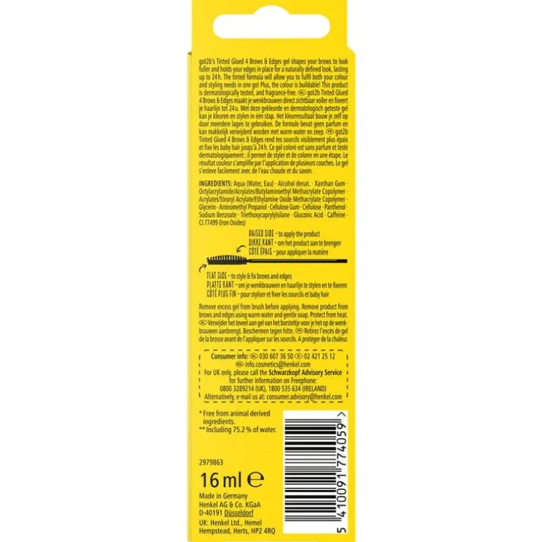 got2b Tinted Glued 4 Brows & Edges maakt je wenkbrauwen direct zichtbaar voller en fixeert je haarlijn tot 24 u. Met deze gekleurde en dermatologisch geteste gel kan je kleuren en stylen in één stap.