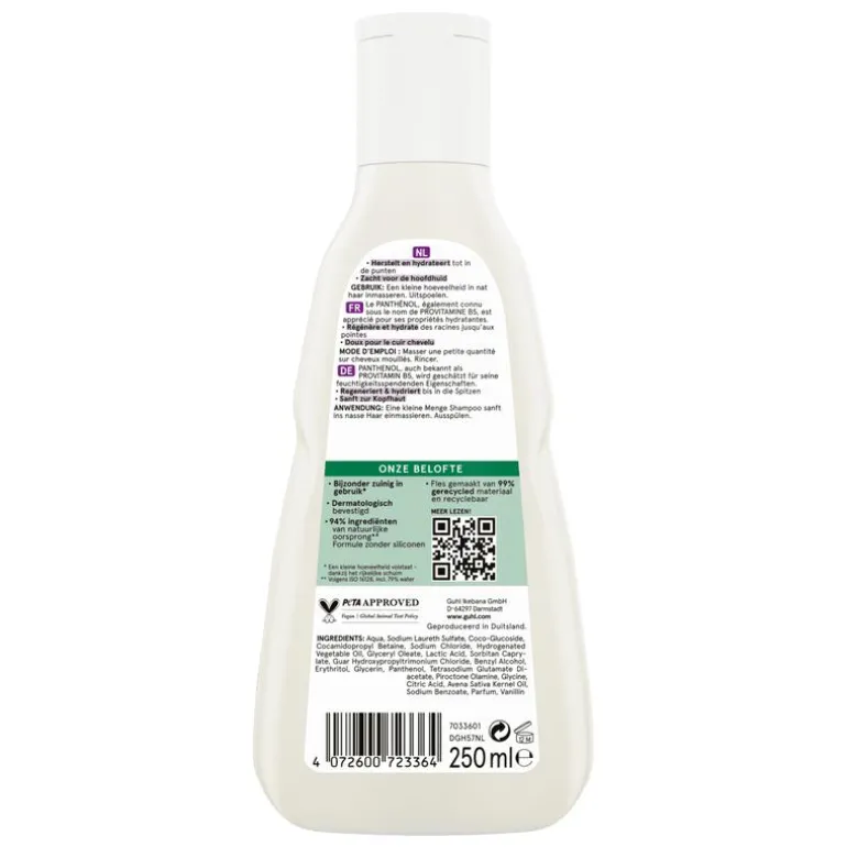 Guhl Panthenol + Reparatie Milde Shampoo is speciaal geschikt voor beschadigd haar. De zachte, maar effectieve formule, met Panthenol-verzorgingscomplex en havermelk, regenereert het haar, voorziet het van vocht en beschermt het tegen externe invloeden – voor gezond uitziend haar. De verzorgende shampoo is zacht voor de hoofdhuid en vrij van siliconen. Het verzorgt van de aanzet tot in de punten, zonder te verzwaren, en biedt het haar een zijdezachte soepelheid en natuurlijke glans. De romige textuur zorgt voor rijk schuim dat het haar zacht omhult en mild reinigt. Tegelijkertijd verwent het met een warme gourmand-geur van romige kokosmelk en een chocolade-nootachtige hartnoot, en transformeert elke wasbeurt in een geurige verzorgingservaring.