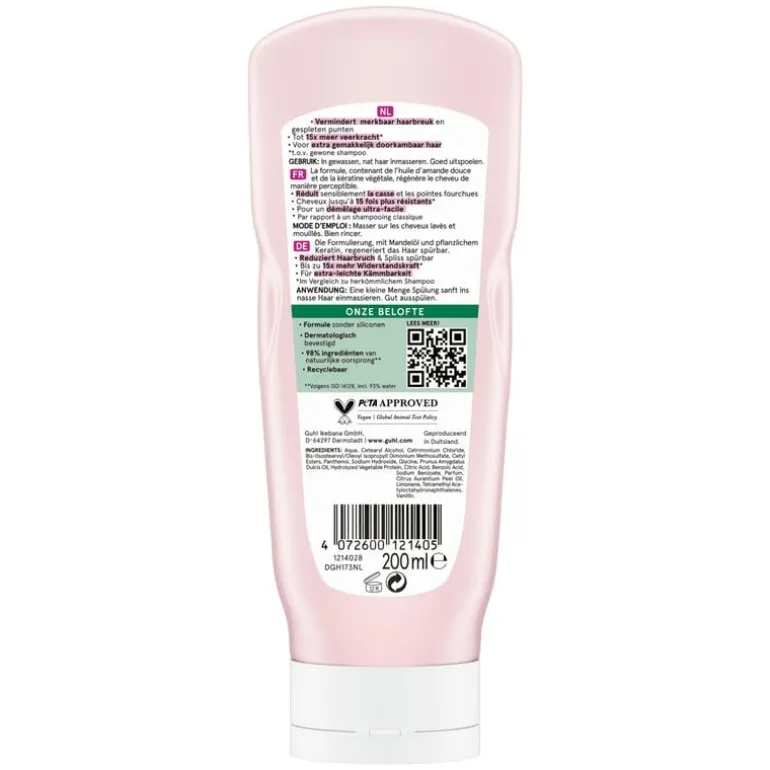 Guhl Rijke Voeding conditioner, voor overbelast, breekbaar en beschadigd haar, herstelt en versterkt doelgericht de haarvezels voor verbeterde veerkracht. De volledige herstelformule beschermt het haar en geeft 93% meer weerstand*. Geeft het haar zijdezachte souplesse en gemakkelijke doorkambaarheid zonder het haar te verzwaren.