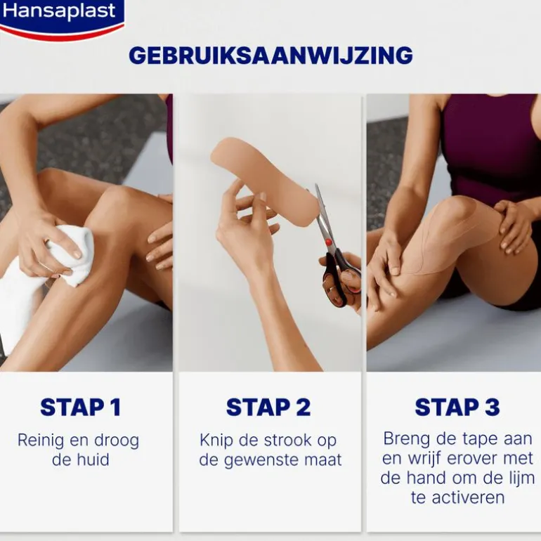 Raadpleeg de gebruiksaanwijzing in de verpakking. Breng de tape minstens 20 minuten voor het sporten aan. Wrijf voorzichtig over de tape wanneer deze is aangebracht om de kleeflaag te activeren.