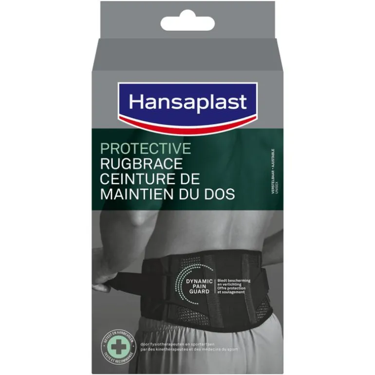 De verstelbare Protective Rugbrace van Hansaplast met Dynamic Pain Guard biedt bescherming en verlichting. Bevat 360° ondersteuningstechnologie die omhullende ondersteuning en stabiliteit biedt aan de onderrug. Met dynamische drukaanpassing die overbelasting vermindert om pijn te verlichten. Het Duo Strapping System biedt extra ondersteuning aan de onderrug. Getest & aanbevolen door fysiotherapeuten en sportartsen.