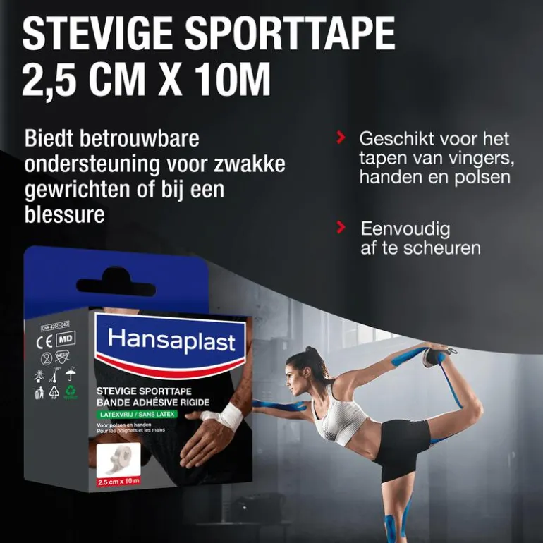 Hansaplast Sport Stevige Sporttape 2,5 CM x 10 M biedt betrouwbare ondersteuning voor zwakke of geblesseerde gewrichten. Door je gewrichten in te tapen stabiliseer en ondersteun je deze. Daarbij verminder je met tape de rek op spieren, pezen, ligamenten en andere zwakkere delen van je lichaam. De tape functioneert hierbij als kunstmatige spier, pees of gewrichtsband.