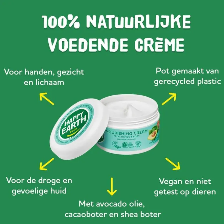 De puurste en meest duurzame verzorging voor jouw huid én voor de aarde. Happy Earth Nourishing Cream is een voedende crème voor je handen, gezicht en lichaam. 100% natuurlijk, 100% verzorgend, zonder chemicaliën en allergeenvrij.