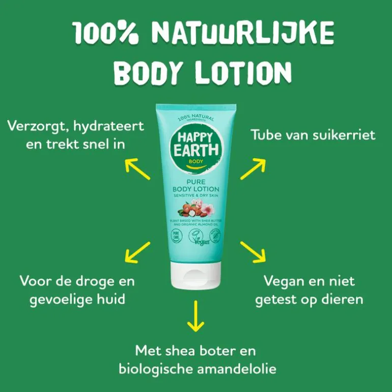 De puurste en meest duurzame verzorging voor jouw huid én voor de aarde. Happy Earth Pure Body Lotion is 100% natuurlijk, 100% verzorgend, zonder chemicaliën en allergeenvrij.