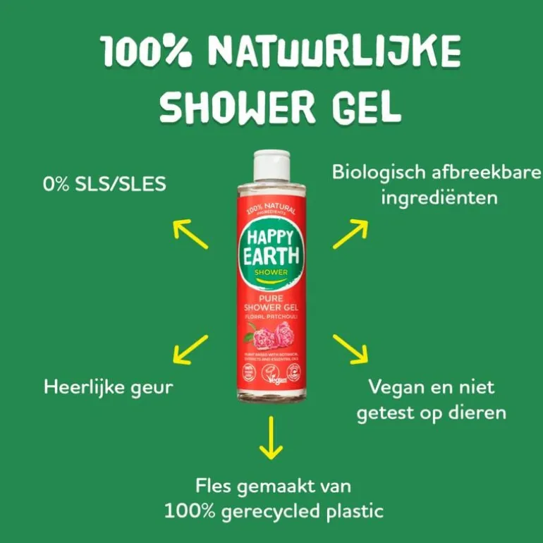Happy Earth 100% natuurlijke Douchegel Floral Patchouli is een 100% natuurlijke, vegan douchegel die gemaakt is van ingrediënten waar je huid en de aarde blij van worden. Alle ingrediënten in deze body lotion zijn gecertificeerd 100% natuurlijk en hebben de Natrue en Vegan Society keurmerken. Als je iets op je huid aanbrengt en door het doucheputje spoelt, is het fijn om te weten dat er geen vervuilende en vervelende ingrediënten in zitten zoals SLS/SLES, parabenen, kleurstoffen of andere nare toevoegingen. Alle douchegels van Happy Earth zijn vrij van microplastics en andere chemicaliën. Met deze shower gel zorg je goed voor jezelf en voor onze aarde!