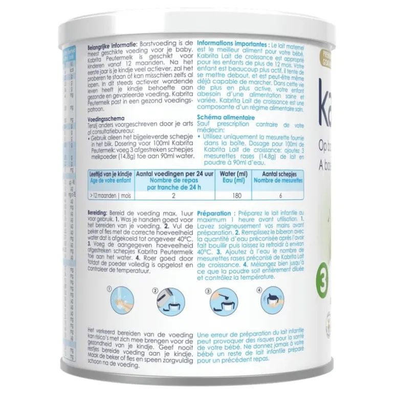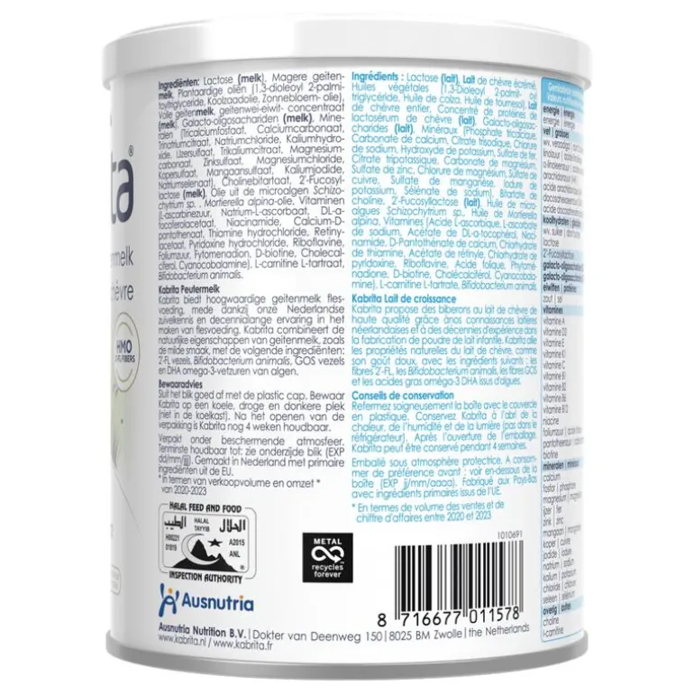 Ingrediënten: Lactose (MELK), Magere geitenMELK, Plantaardige oliën (1,3-Dioleoyl-2-palmitoyltriglyceride, Koolzaadolie, Zonnebloemolie), Volle geitenMELK, Geitenwei-eiwitconcentraat (MELK), Galacto-oligosacchariden (MELK), Mineralen (Tricalciumfosfaat, Calciumcarbonaat, Trinatriumcitraat, Natriumchloride, Kaliumhydroxide, IJzersulfaat, Trikaliumcitraat, Magnesiumchloride, Magnesiumcarbonaat, Zinksulfaat Kopersulfaat, Mangaansulfaat, Kaliumjodide, Natriumselenaat), Fructo-oligosachariden, 2’Fucosyllactose (MELK), Cholinebitartraat, Olie van de microalg Schizochytrium sp., Mortierealla alpina olie, Vitaminen (L-ascorbinezuur, Natrium L-ascorbaat, DL-a tocoferolacetaat, Niacinamide, Calcium D-pantothenaat, Thiaminehydrochloride, Retinylacetaat, Pyridoxine hydrochloride, Riboflavine, Foliumzuur, Fytomenadion, D-biotine, Cholecalciferol, Cyanocobalamine), L-carnitine L-tartraat, Bifidobacterium animalis.