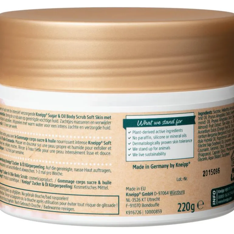Verwen je huid met de intensieve verzorgende Kneipp body scrub Sugar & Oil Soft Skin.