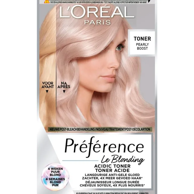 L’Oréal Paris Préférence Post-Bleach Acidic Toner is een toner die ongewenste oranje en gele tonen effectief neutraliseert voor een ultra puur blond resultaat dat lang houdt dankzij de nieuwe ammoniakvrije technologie. Na een ontkleuring, wordt de pH-waarde van het haar alkaline. Dit kan leiden tot dof en poreus haar. De nieuwe Préférence Acidic Toner brengt de pH-waarde weer in balans tot zijn natuurlijke waarden waardoor de haarkwaliteit behouden blijft met voeding en zachtheid. Deze toner zorgt in 5 minuten tot 4 weken voor een anti-gele of -oranje gloed*. Voor 4x meer gevoed* en zijdezacht haar. Deze toner is aanbevolen voor ontkleurd haar. Ideaal na het gebruik van Préférence Ultra Platinum Bleach. Voor haar langer dan de schouders is meer dan één verpakking nodig om al het haar te tonen. Het verheldert de haarkleur niet en het dekt geen grijze haren. In de verpakking vind je toningcrème, ontwikkelcrème, versterkende conditioner en handschoenen. Breng Préférence Acidic Toner en de Versterkende Condtioner aan voor gladder en zijdezacht haar*. *Instrumentele test