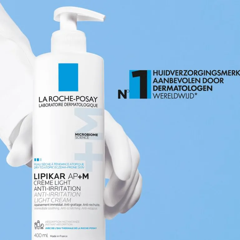 La Roche-Posay Lipikar Baume AP+M Lichte Crème is een geavanceerde, lichte crème speciaal ontworpen voor een droge, jeukende huid met neiging tot atopisch eczeem. De innovatieve formule verzacht de huid onmiddellijk en vermindert jeuk en het gevoel van irritatie door droogheid. Dankzij de unieke AP+M Technologie en Niacinamide wordt het microbioom van de huid ondersteund, waardoor ernstige droogheid minder vaak voorkomt en het helpt de huidbarrière herstellen. La Roche-Posay Lipikar Baume AP+M Lichte Crème ondersteunt en beschermt de huidbarrière door jeuk, irritatie en uitdroging van de huid tegen te gaan. Verrijkt met 5% Sheaboter, voedt het de huid diepgaand en herstelt het de huidbarrière. De niet-plakkerige textuur voelt soepel aan en trekt snel in, wat dagelijks gebruik vergemakkelijkt. Het product is geschikt voor alle huidtypen, van baby’s tot volwassenen, inclusief de meest gevoelige huid en huid met neiging tot allergische reacties, en zelfs voor patiënten die een kankerbehandeling ondergaan. Regelmatig gebruik vermindert jeuk, verbetert de levenskwaliteit en vermindert slaapstoornissen veroorzaakt door jeuk. De fles is bovendien gemaakt van 100% gerecycled plastic met uitzondering van de pomp, kleurstoffen en additieven.