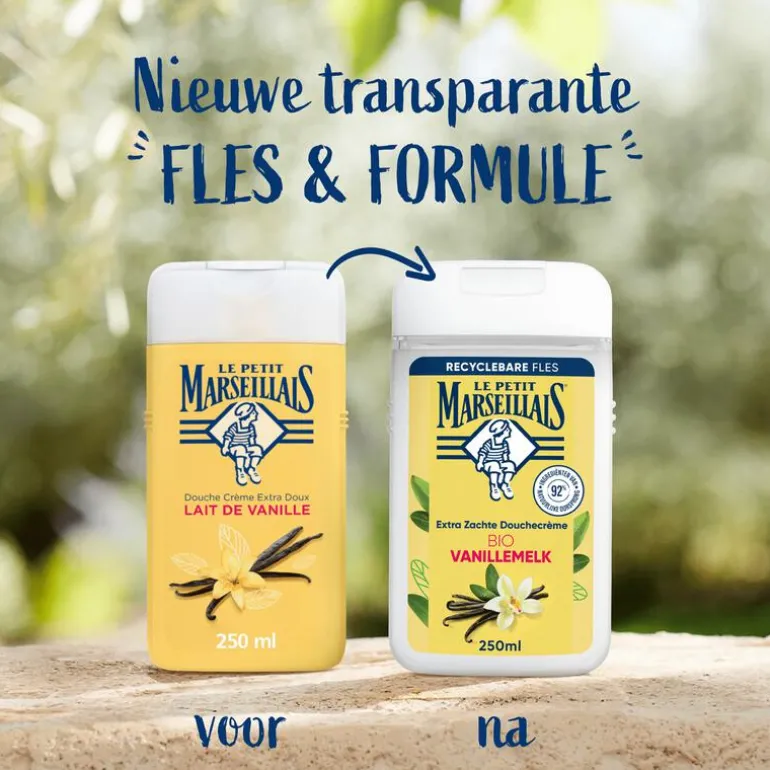 Het verhaal van Le Petit Marseillais begint in het prachtige Zuid-Frankrijk. Geïnspireerd door de Provence kreeg hij een onweerstaanbaar verlangen om een nieuwe formule te ontwikkelen die de geur van de natuur tot leven brengt. De lancering van de nieuwe extra zachte douchecrèmes omhullen de huid met zachtheid en biedt extra veel plezier en natuur onder de douche! De bio vanillemelk vormt een natuurlijk, zachte basis voor deze douchecrème. De vanillestokjes worden met de hand geoogst en vervolgens een lange tijd gedroogd voordat het een heerlijke vanillemelk wordt. De vanillemelk heeft een zachte en delicate geur. Le Petit Marseillais extra zachte douchecrème hydrateert en voedt de huid optimaal. De douchecrème is pH-neutraal voor de huid en dermatologisch getest.