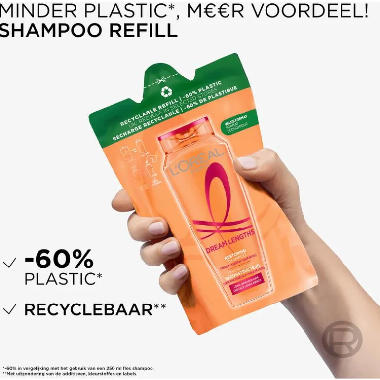 Minder plastic*, m€€r voordeel. Word ook een shampoo refiller! L’Oréal Paris Elvive Dream Lengths Shampoo is een shampoo die speciaal is ontworpen om lang, beschadigd haar van de wortels tot de punten grondig te voeden en te herstellen. De L’Oréal Paris Elvive Dream Lengths shampoo verzorgt het haar intensief met hoogwaardige ingrediënten, waaronder plantaardige keratine en castorolie die beschadigde haarlengtes tot diep in de haarvezels herstellen. Het resultaat: haar dat gezonder oogt en opnieuw prachtig glanst. Deze Shampoo Refill is gemaakt van 60% minder plastic in vergelijking met het gebruik van onze 250ml fles shampoo.