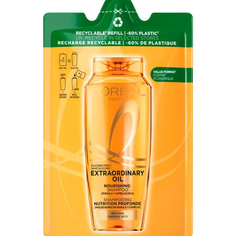 Minder plastic**, m€€r voordeel. Word ook een shampoo refiller! L’Oréal Paris Elvive Extraordinary Oil Shampoo biedt een sublieme verzorging speciaal ontwikkeld voor droog haar, zodat je lokken weer zacht, soepel en stralend aanvoelen. L’Oréal Paris Elvive Extraordinary Oil Shampoo is verrijkt met marula- en camelia-olie die je haar diep en intens tot wel 8 weken voeden*. Deze siliconenvrije formule is zacht voor je haar en zorgt voor een natuurlijke, gezonde glans zonder het haar te verzwaren. Deze Refill is gemaakt van 60% minder plastic in vergelijking met het gebruik van onze 250ml fles shampoo.