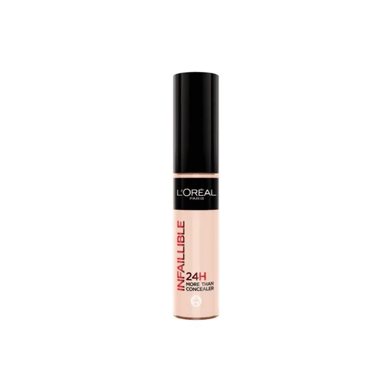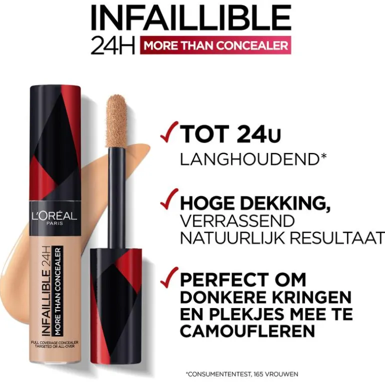 L’Oréal Paris Infaillible More Than Concealer is een dekkende concealer met matte finish. Deze hydraterende concealer blijft goed zitten én geeft tot 24 uur* lang dekking die er verrassend natuurlijk uitziet. Dat betekent dat je deze concealer perfect kunt gebruiken om donkeren kringen en plekjes mee te camoufleren. De concealer trekt niet in de fijne lijntjes van de huid en geeft een mooi egaal resultaat. Daarnaast is deze concealer waterproof, zweetproof en non-comedogeen, dit houdt in dat de formule de poriën niet verstopt. Ideaal dus voor een gevoelige of onrustige huid. Als je de concealer koopt in een kleur die lichter of donkerder is dan jouw huidskleur kun je deze concealer ook gebruiken om te contouren. De formule is vegan en bevat geen ingrediënten of bijproducten van dierlijke oorsprong. *Consumententest, 165 vrouwen