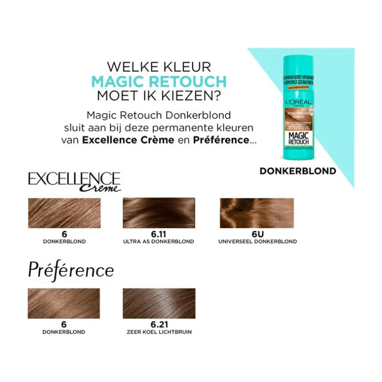 L’Oréal Paris Magic Retouch is een uitwasbare, camouflerende uitgroeispray die jouw uitgroei in 3 seconden laat verdwijnen. De uitgroeispray camoufleert uitgroei tot de eerstvolgende wasbeurt met shampoo. Wanneer je jouw haar kleurt, wordt uitgroei tussen de kleurbeurten door zichtbaar. Magic Retouch uitgroeispray is ontwikkeld om deze uitgroei te camoufleren. Magic Retouch zit in een spuitbus, waardoor je met het handige spraysysteem de formule snel en eenvoudig aanbrengt. De spray mengt zich met de haarkleur van het gekleurde haar, waardoor kleurverschil tot een minimum wordt beperkt en het resultaat natuurlijk oogt. De uitgroeispray dekt uitgroei volledig en is ideaal voor het camoufleren van grijs haar. De formule droogt snel en blijft de hele dag goed zitten. Met behulp van shampoo is de uitgroeispray direct uitwasbaar. Magic Retouch uitgroeispray is beschikbaar in verschillende kleuren. Kies de kleur die zo dicht mogelijk bij de kleur van jouw gekleurde haar ligt voor een zo natuurlijk mogelijk resultaat.