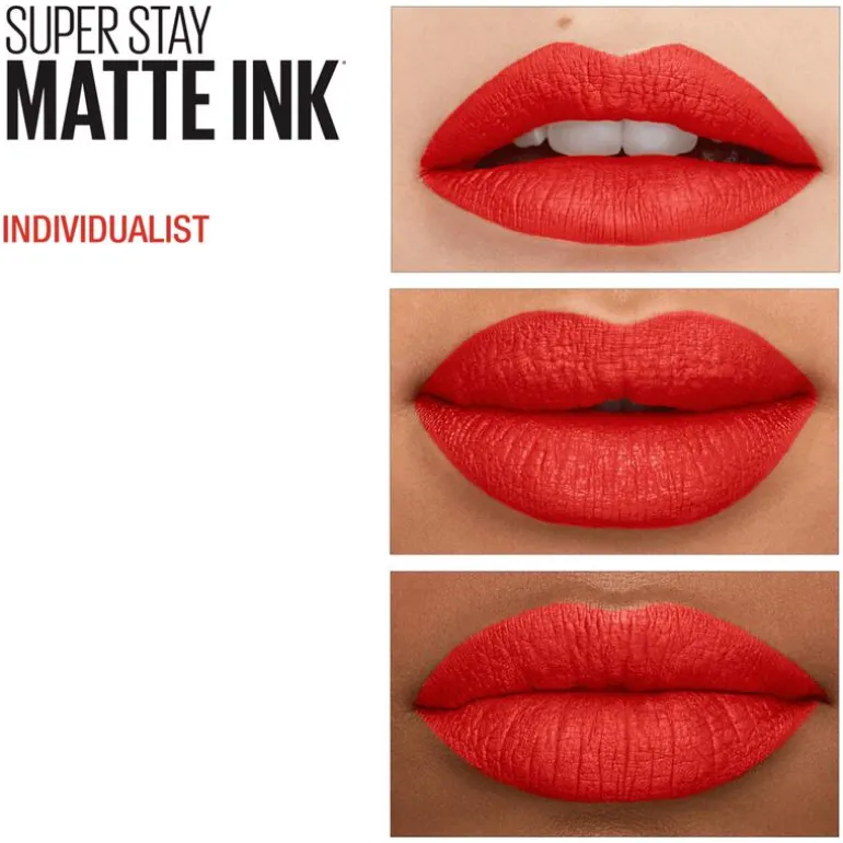 De Maybelline New York SuperStay Matte Ink 320 Indivualist Lipstick is een langhoudende rode lippenstift met een trendy, ultramatte finish die tot 16 uur blijft zitten.