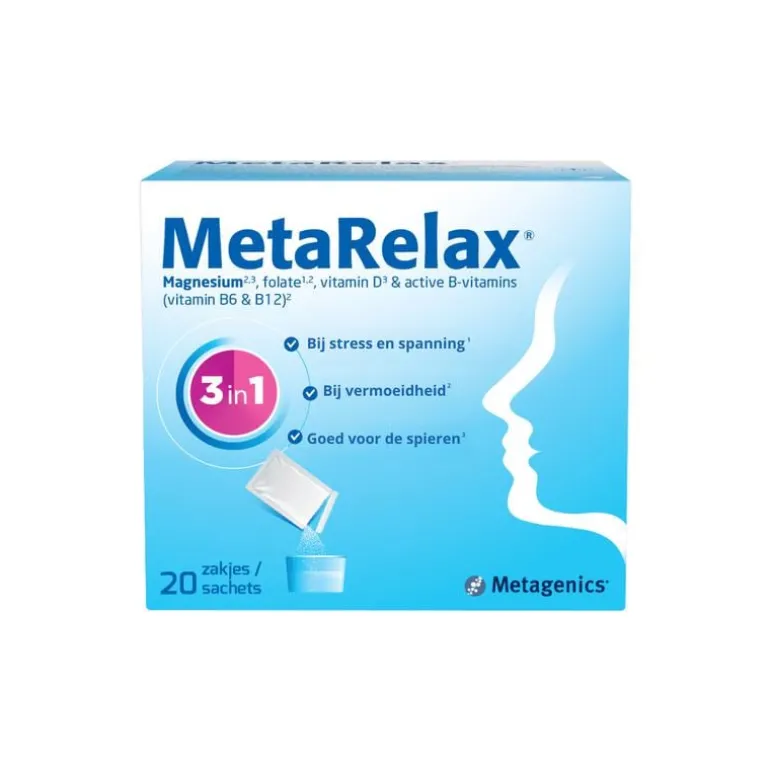 MetaRelax® is een goed opneembaar, hoogwaardig magnesiumsupplement dat speciaal is ontwikkeld om te gebruiken bij stress & spanning (folaat) en vermoeidheid (magnesium en folaat) en is goed voor de spieren (vitamine D).