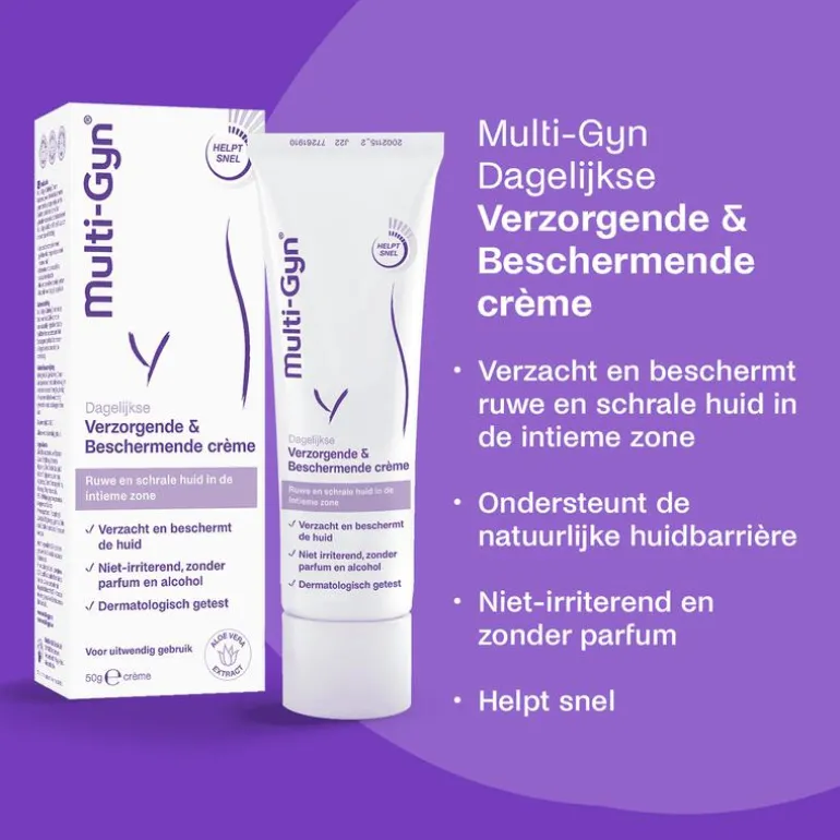 “Multi-Gyn Verzorgende & Beschermende Crème kalmeert, verlicht en beschermt geïrriteerde, droge en jeukende huid in de uitwendige intieme zone, veroorzaakt door scheren/waxen, kleding, transpiratie of zeep. Het 2QR-complex ondersteunt de natuurlijke huidbarrière van de intieme huid, en verlicht direct de geïrriteerde huid.