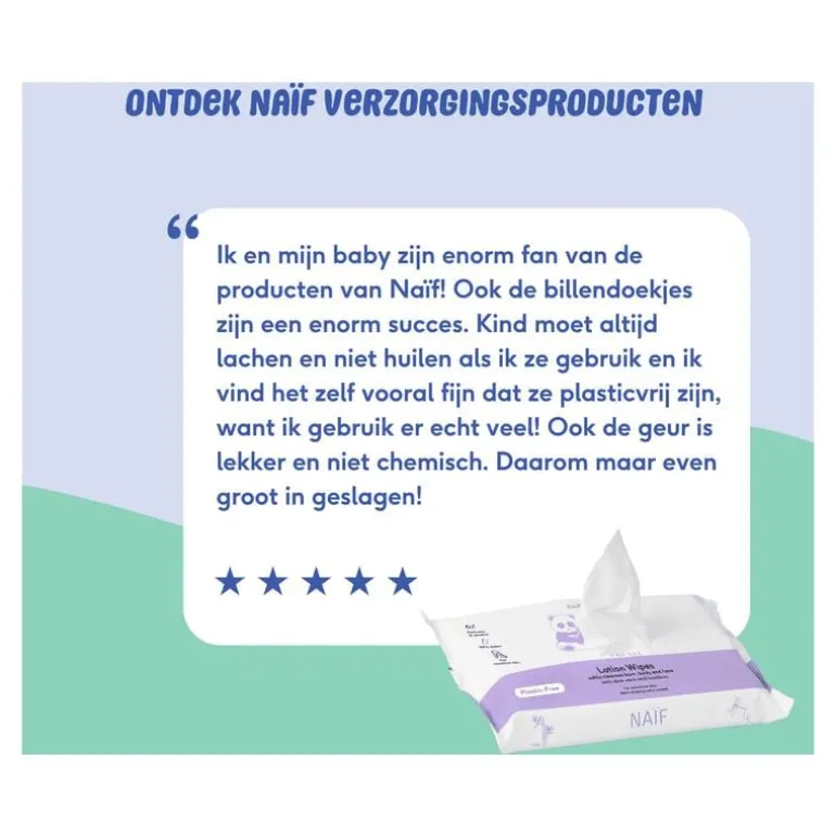 Naïf plasticvrije lotion doekjes zijn alles wat je van een billendoekje mag verwachten: sterk, goed vochtig, met ingrediënten die de gevoelige babyhuid goed verzorgen. Daar horen polyester vezels en microplastics niet bij. Dus, gewoon een fijn doekje, dat reinigt en verzorgt. Ze zijn dermatologisch getest en te gebruiken voor alle leeftijden (ook direct na de geboorte). Ook geschikt als snoetenpoetser trouwens!