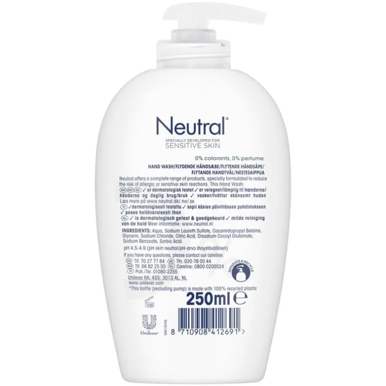 De Neutral Hand Wash is zeepvrij en bevat verzorgende ingrediënten die de huid zo min mogelijk belasten. Hiermee wordt het risico op allergische of huidreacties beperkt tot een minimum. De Neutral handzeep reinigt je huid op een zeer milde wijze. De handzeep is geschikt voor dagelijks gebruik. Je handen wassen is van groot belang, aangezien er veel bacteriën op kunnen zitten. De Neutral handzeep bevat geen overbodige toevoegingen, maar bevat alleen datgene wat je handen nodig hebben. Neutral geeft je handen een goede verzorging en beschermt tegen huidirritaties. De handzeep bevat geen parabenen, kleurstoffen of parfum. De handwash geeft je huid de meest complete verzorging en reiniging. Wanneer je een allergie of een gevoelige huid hebt, mag dit geen belemmering zijn om van het dagelijks leven te genieten. Neutral heeft zich daarom gespecialiseerd in producten die het risico op huidirritatie verminderen. Alle producten van Neutral bevatten daarom ook geen toevoegingen, waaronder parfum en kleurstoffen. Deze stoffen verhogen het risico op huidirritatie namelijk. Verder biedt Neutral een complete range van huishoudelijke- en huidverzorgings- producten die speciaal ontwikkeld zijn om het risico op allergische- of huidreacties te verminderen. Neutral 0% producten worden aanbevolen door de Danish Asthma en Allergy Association en zijn speciaal ontwikkeld voor de gevoelige huid. Neutral, dat voelt goed. Voor meer informatie, bezoek www.Neutral.nl