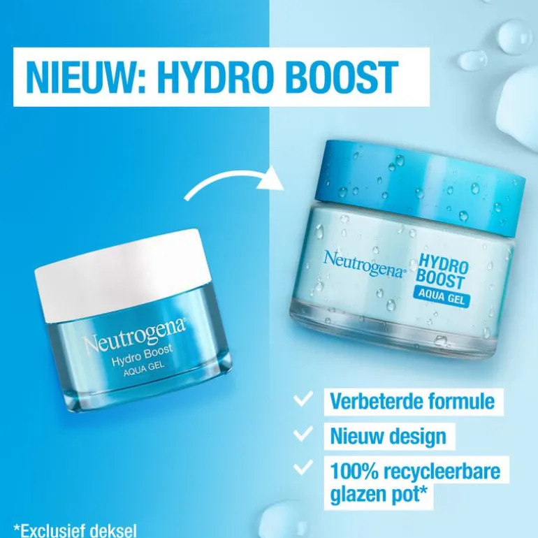 Ontdek nu de nieuwe en verbeterde Hydro Boost formule van Neutrogena! Dankzij de ultralichte watergelformule en hydraterende ingrediënten zoals: aminozuren, elektrolyten, en hyaluronzuur wordt de huid tot wel 6x meer gehydrateerd gedurende 72 uur. Dit resulteert in een soepele, gezond uitziende huid met een 80% sterkere huidbarrière De nieuwe formule bevat 20% meer hyaluronzuur dat helpt vocht vast te houden en de hydratatie te verhogen. Het aminozuur versterkt de huid en zorgt voor extra ondersteuning van de huidbarrière. De elektrolyten bevorderen de opname van de ingrediënten. De nieuwe Neutrogena Hydro Boost Aqua Gel is vrij van parfum, olie en niet-comedogeen. Ontwikkeld in samenwerking met dermatologen en geschikt voor de normale en gemengde huid. Ook voor de gevoelige en acne gevoelige huid. De nieuwe verpakking bevat 87% minder plastic en wordt geleverd in een 100% recyclebare glazen pot. Ontdek nu de nieuwe Neutrogena® Hydro Boost Aqua Gel!