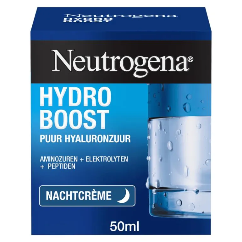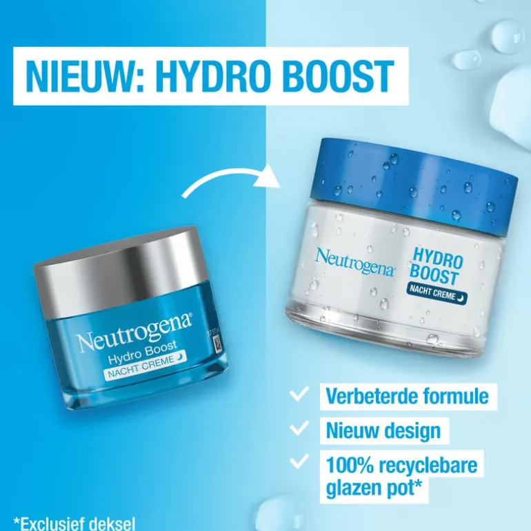 Ontdek nu de nieuwe en verbeterde Hydro Boost formule van Neutrogena! Dankzij de snel absorberende formule en hydraterende ingrediënten zoals: aminozuren, elektrolyten, hyaluronzuur en peptiden wordt de huid tot wel 6x meer gehydrateerd gedurende nacht. Dit resulteert in een soepele en energiek uitziende huid met een 80% sterkere huidbarrière. De nieuwe formule bevat 20% meer hyaluronzuur dat helpt vocht vast te houden en de hydratatie te verhogen. Het aminozuur versterkt de huid en zorgt voor extra ondersteuning van de huidbarrière. De elektrolyten bevorderen de opname van de ingrediënten en de peptiden zorgen voor een voelbaar soepele huid. De Neutrogena Hydro Boost nachtcrème is olievrij en niet-comedogeen. Ontwikkeld in samenwerking met dermatologen en geschikt voor alle huidtypes. Ook voor de gevoelige en acne gevoelige huid. Wordt geleverd in een nieuwe 100% recyclebare glazen pot en bevat 87% minder plastic. Ontdek nu de nieuwe Neutrogena® Hydro Boost nachtcrème!