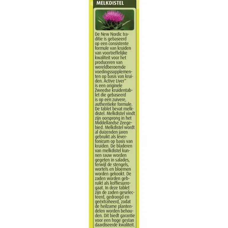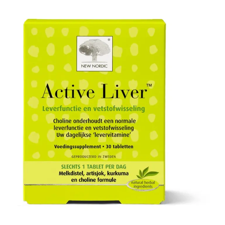 Uw lever gezond houden? New Nordic Active Liver is een complete kruidencombinatie van choline, artisjok, kurkuma, melkdistel en zwarte peper, die uw lever kan helpen ondersteunen. De lever is ons grootste interne orgaan en ondersteunt de reiniging van het lichaam.Het leversupplement bevat choline, dat bijdraagt aan de instandhouding van de normale leverfunctie. De natuurlijke extracten van melkdistel* en artisjok ondersteunen de lever- en galfunctie terwijl artisjok bovendien ook het afslanken stimuleert. Het gehalte aan kurkuma zorgt voor het behoud van een normale leverfunctie en vetstofwisseling. Van de dagelijkse ‘levervitamine’ Active Liver hoeft u slechts 1 tablet per dag in te nemen. De verpakking van New Nordic Active Liver is 100% recyclebaar.