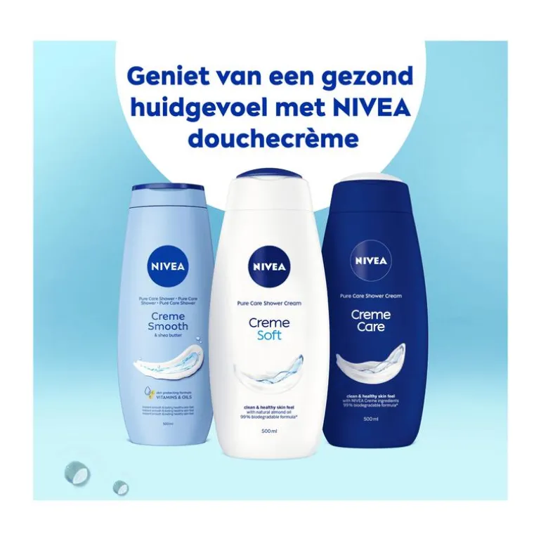 NIVEA Creme Soft Douchecrème 250ml, is een verzorgende douchecrème voor een gehydrateerd huidgevoel. Laat deze douchecrème met amandelolie je huid omhullen met verzorgend zacht schuim, terwijl de milde geur je zintuigen streelt. De verzorgende formule verwent je huid en laat haar zacht en gehydrateerd aanvoelen. Maak van een alledaagse douche een moment om te genieten met de verzorging van NIVEA. De formule is 99% biologisch afbreekbaar* en respecteert het microbioom van de huid. Een gezond uitziende huid voelde nog nooit zo goed. Douchecrème met amandeloliën. Een formule die het microbioom van de huid respecteert. Met een 99% biologisch afbreekbare formule* *volgens OESO of gelijkwaardige methoden