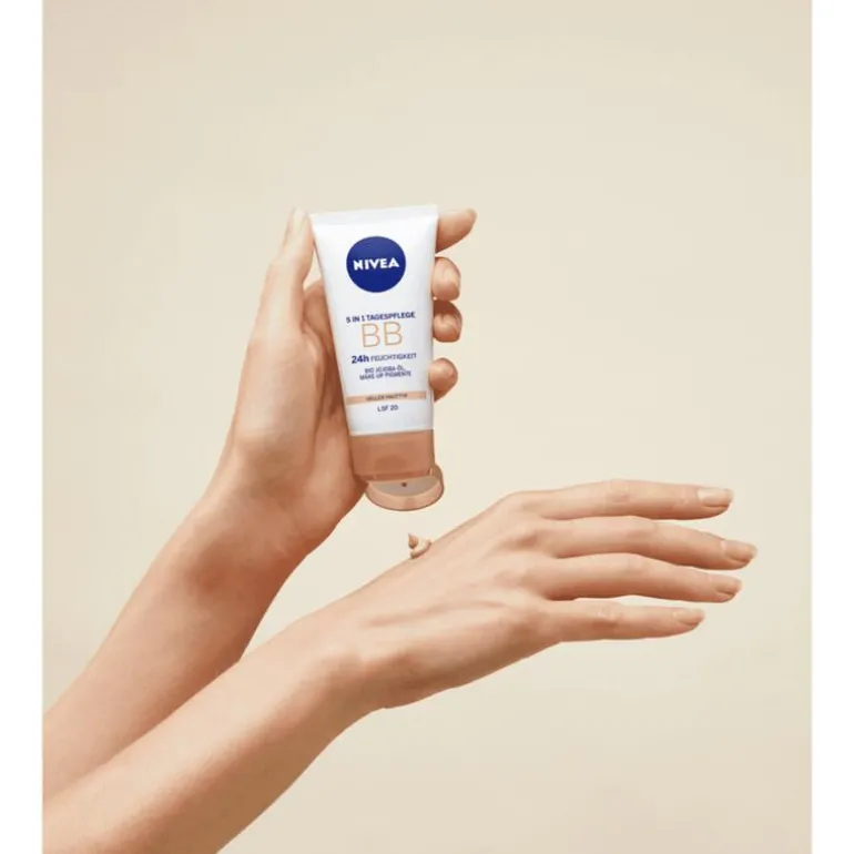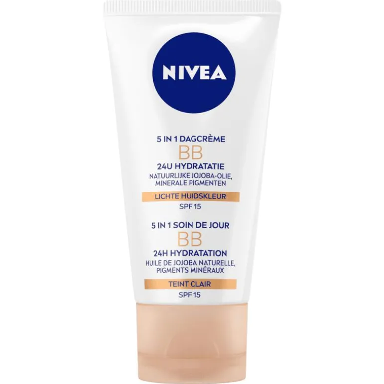 NIVEA 5in1 BB Dagcrème Light is een getinte crème die de huid niet alleen verzorgt, maar die ook kleine imperfecties camoufleert. Gebruik de BB cream om pigmentvlekjes, acne, donkere kringen rond de ogen, fijne lijntjes en tekenen van vermoeidheid minder zichtbaar te maken. De formule van de getinte dagcrème biedt ook 24 uur lang hydratatie, waardoor je van een zachte huid met een egale teint geniet. De SPF15 biedt bescherming tegen door zonlicht veroorzaakte huidveroudering en verkleuringen. NIVEA Essentials 5in1 BB Dagcrème Light bevat minerale pigmenten die de huid egaliseren en zich aanpassen aan je natuurlijke teint, terwijl natuurlijke jojoba-olie hydrateert en de vochtbalans herstelt, terwijl vitamine E als antioxidant de huid beschermt tegen schadelijke invloeden van buitenaf. De BB Dagcrème Light heeft een vegan formule* en komt in een 89% recycleerbare tube**. *Geen ingrediënten van dierlijke oorsprong. **Instituut Cyclos-HTP certificaat voor Nederland en België. • Hydrateert de huid tot 24 uur lang • Camoufleert acne, fijne lijntjes, donkere kringen en pigmentvlekjes • Beschermt de huid tegen schade van buitenaf • Verrijkt met jojoba-olie • Geschikt voor de lichte huid