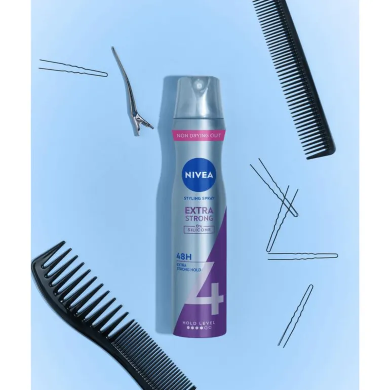NIVEA Extra Strong Styling Spray biedt je haar 48 uur lang extra sterke stylingcontrole, zonder dat het uitdroogt. Deze vegan formule bevat Panthenol en Vitamine B3, die je haar versterken en beschermen, waardoor het er gezond en glanzend uitziet. De spray is gemakkelijk uit te kammen, zodat je moeiteloos kunt wisselen van stijl, zonder residu achter te laten. Ideaal voor wie op zoek is naar langdurige fixatie zonder compromis, NIVEA Extra Strong Styling Spray zorgt voor een flexibele, sterke hold die je haar natuurlijk laat bewegen. Perfect voor dagelijks gebruik en geschikt voor alle haartypen, met een formule die zacht is voor je haar en hoofdhuid. Styling en verzorging in één, voor de perfecte look die blijft zitten, zonder je haar te verzwaren of te beschadigen.