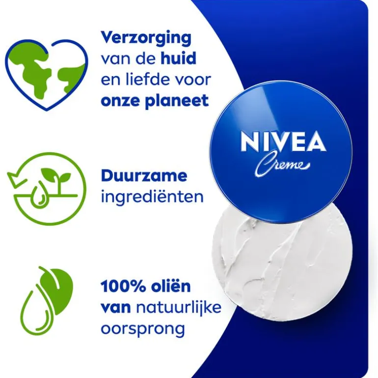 De huidvriendelijkheid is dermatologisch goedgekeurd, wat betekent dat je met een gerust hart kunt genieten van deze diep verzorgende crème. Of je nu op zoek bent naar een bodylotion, handcrème voor droge handen, of een fijne huidverzorging voor je dagelijkse lichaamsverzorging, de NIVEA Crème Blik biedt de ideale oplossing voor iedereen. **Uitgezonderd parfum; oliën die meer dan 50% van hun natuurlijke staat behouden na verwerking.