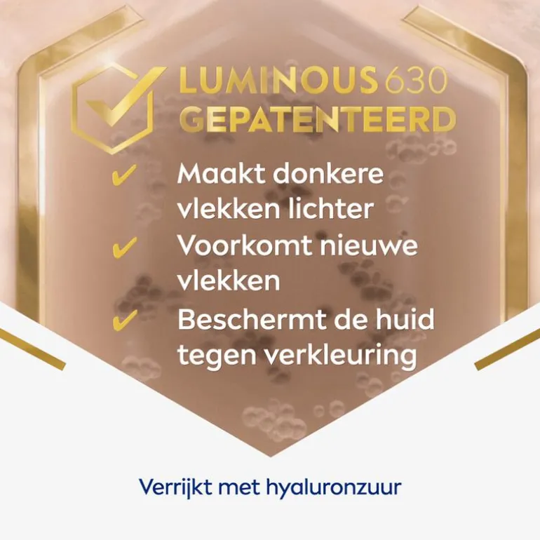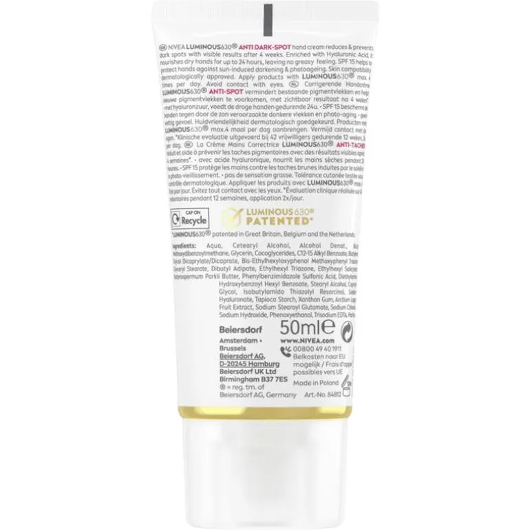 NIVEA Luminous630 Anti Spot Handcreme Anti Pigment zorgt bewezen voor gladde, zachte en vooral een jonger aanvoelende huid. De innovatieve formule verrijkt met Luminous630 en het huidherstellende serum hyaluronzuur vermindert vlekken op de handen en helpt nieuwe pigmentvlekken te voorkomen. Tegelijkertijd worden droge handen intensief gevoed gedurende 24 uur. SPF 15 helpt de handen te beschermen tegen door het zonlicht veroorzaakte donkere vlekken en photo-aging. De handcrème vermindert tevens het ontstaan van fijne lijntjes en rimpels. De SPF 15 beschermt de huid van de handen tegen zonlicht en heeft een anti-age effect omdat het de vorming van rimpels vermindert. Ervaar zelf het verzachtende gevoel van deze anti pigment handcrème.