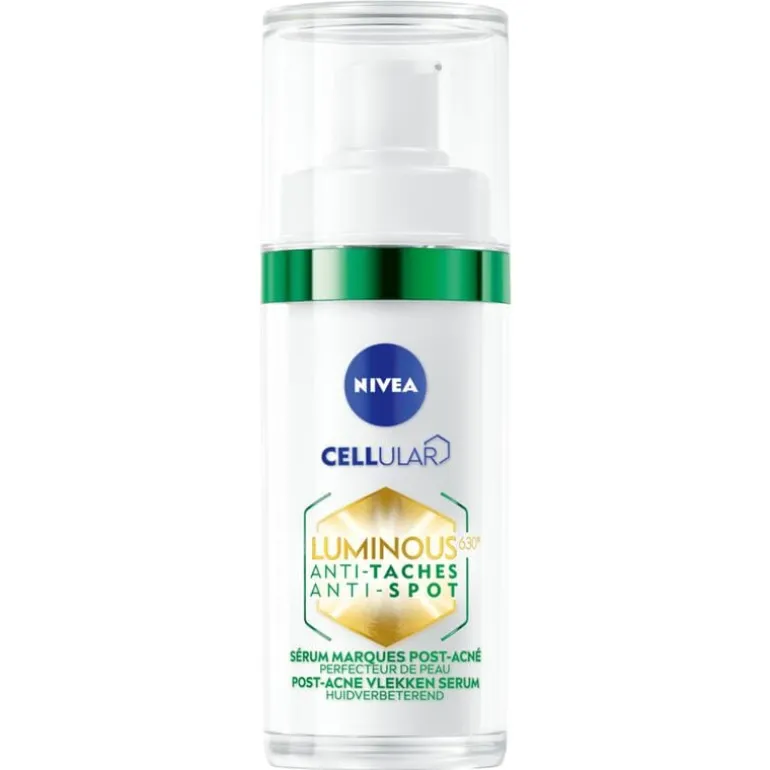 Verminder donkere vlekken na acne effectief met het NIVEA CELLular LUMINOUS630 Anti-spot Post-acne vlekken Serum. Dit serum heeft een de gelachtige textuur en vermindert zichtbaar donkere vlekjes na acne binnen twee weken. NIVEA CELLular LUMINOUS630 Anti-spot Post-acne vlekken Serum is speciaal ontwikkeld voor de behoeften van de vette, gemengde en onzuivere huid. De speciale formule werkt drievoudig. Zo vermindert het serum zichtbaar donkere vlekken na acne en maakt het de huid glad. Genit van de matte finish. Kalmeer de vette huid en straal weer dankzij de bestanddelen in het NIVEA CELLular Luminous Post-acne vlekken serum.Het NIVEA Luminous Anti-spot serum bevat LUMINOUS630 voor het verminderen van donkere vlekken na acne, salicylzuur voor exfoliatie, hyaluronzuur voor hydratatie en groene thee-extract om de huid in balans te brengen. Na 2 weken zijn de donkere vlekken zichtbaar lichter*, en na 12 weken meldt 100% van de vrouwen een vermindering van hun donkere vlekken. • Vermindert donkere vlekken na acne• Exfolieert en egaliseert de huid• Heeft een matterende werking• Brengt de huid tot rust• Verrijkt met LUMINOUS630, salicylzuur, hyaluronzuur en groene thee-extract
