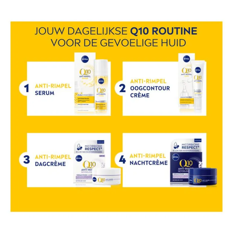 NIVEA Q10 POWER Sensitive Anti-rimpel Dagcrème is een verzachtende en verzorgende dagcrème die geschikt is voor de gevoelige huid. De speciale formule werkt niet alleen effectief tegen rimpels en fijne lijntjes, maar laat de huid ook steviger aanvoelen. Tegelijkertijd worden de drie tekenen van de gevoelige huid verminderd: roodheid, droogheid en een trekkerig gevoel. De dagcrème is parfumvrij en heeft een kalmerende werking, terwijl je ook van de bescherming van SPF 15 geniet. Zo wordt je huid beschermd tegen uv A/uv B, wat rimpelvorming helpt voorkomen, maar ook huidirritaties voorkomt. NIVEA Q10 POWER Sensitive Anti-rimpel Dagcrème bevat Q10 en creatine, die de collageenaanmaak stimuleren voor een stevigere huid en minder rimpels. Het toegevoegde zoethoutextract kalmeert en vermindert roodheid en irritatie, terwijl de formule dermatologisch is goedgekeurd. • Maakt rimpels en fijne lijntjes minder zichtbaar • Vermindert de drie tekenen van de gevoelige huid • Beschermt, voedt en verstevigt de huid • Met Q10, creatine en zoethoutextract • Met SPF 15
