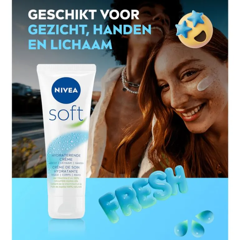 NIVEA Soft is de ideale verzorging van top tot teen. De hydraterende olie-in-water formule verzorgt en verfrist de huid. De lichte formule met vitamine E en jojobaolie trekt snel in en zorgt voor een heerlijk zachte, ontspannen huid. Zie je er vermoeid uit, dan kan je gezichtshuid wel een hydraterende crème gebruiken. Heb je ruwe handen van het klussen, dan verwen je die eveneens met de hydraterende crème van NIVEA Soft. Hele dag in de tuin gewerkt? Lekker douchen en daarna die verwennerij met dezelfde crème. Zo wordt alle andere bodyolie of bodymilk overbodig.
