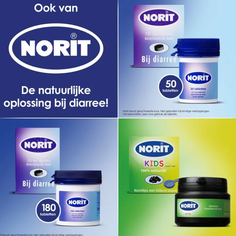 Diarree is hele dunne ontlasting die meerdere keren op een dag plaatsvindt. Diarree kan plotseling ontstaan en gaat vaak gepaard met buikkrampen, braken of koorts. Een heel vervelend en ongemakkelijk probleem waar je snel van af wilt. Gebruik daarom Norit capsules.Norit is generaties lang het vertrouwde merk bij diarree. Voor volwassenen en kinderen. Norit is 100% natuurlijk. De werkzame stof is actieve kool. Dit is een 100% plantaardige natuurlijke kool dat ervoor zorgt dat de schadelijke stoffen die diarree veroorzaken op een natuurlijke wijze het lichaam verlaten zodat je lichaam weer normaal gaat functioneren. Norit verwijdert niet alleen de oorzaak van diarree, het herstelt en reinigt ook de darmen. Hierdoor verdwijnt de diarree en wordt de ontlasting weer normaal.