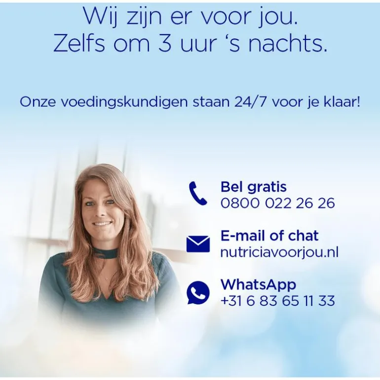 - Heb je vragen over de voeding van je kindje? Onze voedingskundigen staan 24/7 voor je klaar. Bel de Nutricia Kindervoeding Service op: 0800 022 26 26