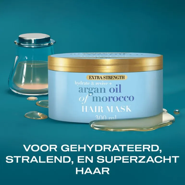Gun je haar een intensieve, herstellende behandeling met dit luxueuze haarmasker van OGX. Deze krachtige formule is speciaal ontwikkeld om droge, broze en beschadigde lokken nieuw leven in te blazen. Verrijkt met voedende arganolie uit Marokko en zijde-eiwitten, dringt het diep door in het haar om vocht aan te vullen, breuk te helpen voorkomen en de natuurlijke zachtheid te herstellen. De rijke, crèmige textuur hydrateert intens en laat je haar al na 60 seconden voelbaar zachter en zichtbaar gezonder aanvoelen.