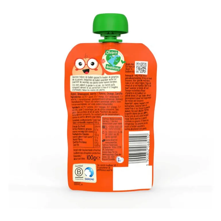Olvarit knijpfruit appel sinaasappel wortel, geschikt voor baby’s vanaf 6 maanden oud. Het knijpzakje zit boordevol fruit en is ideaal als leuk, lekker en verantwoord tussendoortje!