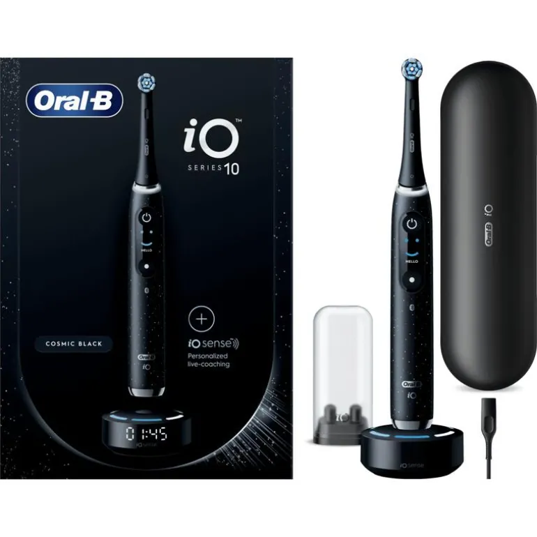 De iO 10 elektrische tandenborstel met de revolutionaire slimme iO Sense oplader personaliseert uw poetsstijl met realtime feedback, begeleidt u voor perfecte dekking, poetstijd en poetsdruk voor een heerlijk moeiteloze reiniging. Hij combineert zachte microtrillingen met een unieke, door tandartsen geïnspireerde ronde opzetborstel voor een professionele reiniging, elke dag. Vervang de Oral-B iO opzetborstel elke 3 maanden voor de beste resultaten.