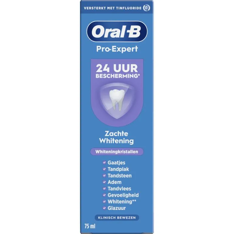 De Oral-B Pro-Expert Zachte Whitening tandpasta is klinisch bewezen: het biedt 24 uur bescherming bij twee keer per dag gebruik, de antibacteriële technologie met tinfluoride-complex creëert een beschermend schild om de groei van bacteriële tandplak te helpen verminderen, zelfs tussen de poetsbeurten door. Een frisse Groene muntsmaak gecombineerd met zoete aromaten en verfrissende menthol voor een opbeurende koele sensatie