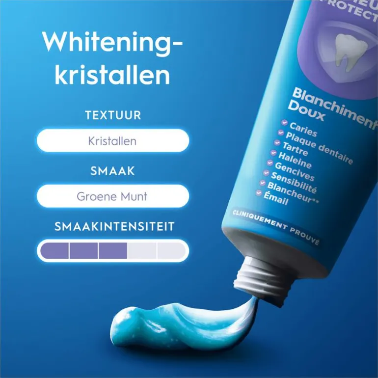 - Beschermt op acht gebieden: gaatjes, tandplak, tandsteen, adem, tandvlees, gevoeligheid, oppervlakkige verkleuringen, glazuur