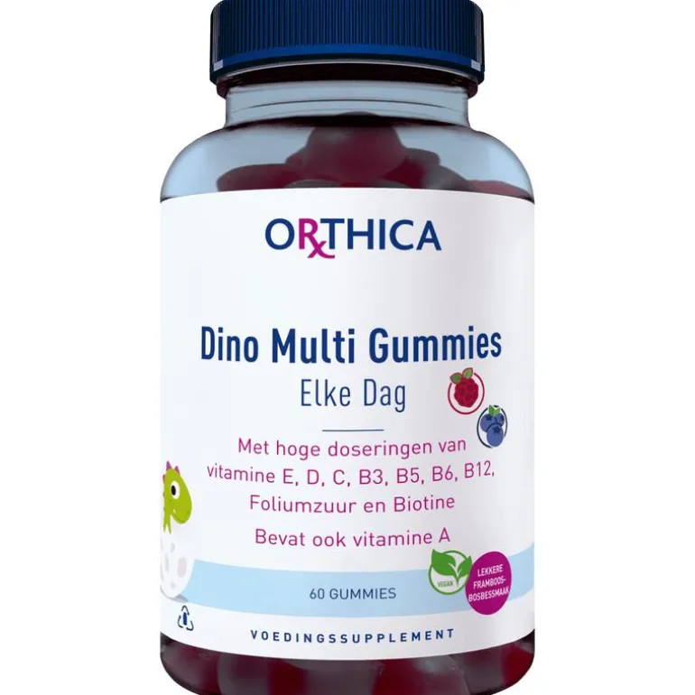 Vegan multivitamine in smakelijke en makkelijk in te nemen gummies. Als gezonde voeding er wel eens bij inschiet, kan een multivitamine een goede aanvulling zijn. Onze Dino Multi Gummies hebben een lekkere framboos-bosbessmaak, en zijn makkelijk in te nemen doordat ze kauwbaar zijn. Handig voor kinderen die moeite hebben met het slikken van tabletten! De Dino Multi Gummies bevatten een hoge dosering essentiële v itaminen die het lichaam ondersteunen. Vitamine A, B6, foliumzuur, B12, C en D helpen het immuunsysteem. Vitamine B6, B12, C en biotine (B8) ondersteunen het energieniveau. Deze vitaminen helpen bij het vrijmaken van energie uit voeding. Vitamine B6, foliumzuur, B12, C en biotine zijn geschikt bij geestelijke inspanning. Daarnaast ondersteunen vitamine B6, foliumzuur, B12 en C bij moeheid. Er wordt geen gebruik gemaakt van gelatine en de gebruikte vitamine D3 is uit algen onttrokken. Hiermee is deze gummie vegan. Deze multivitamine is geschikt voor kinderen vanaf 4 jaar.