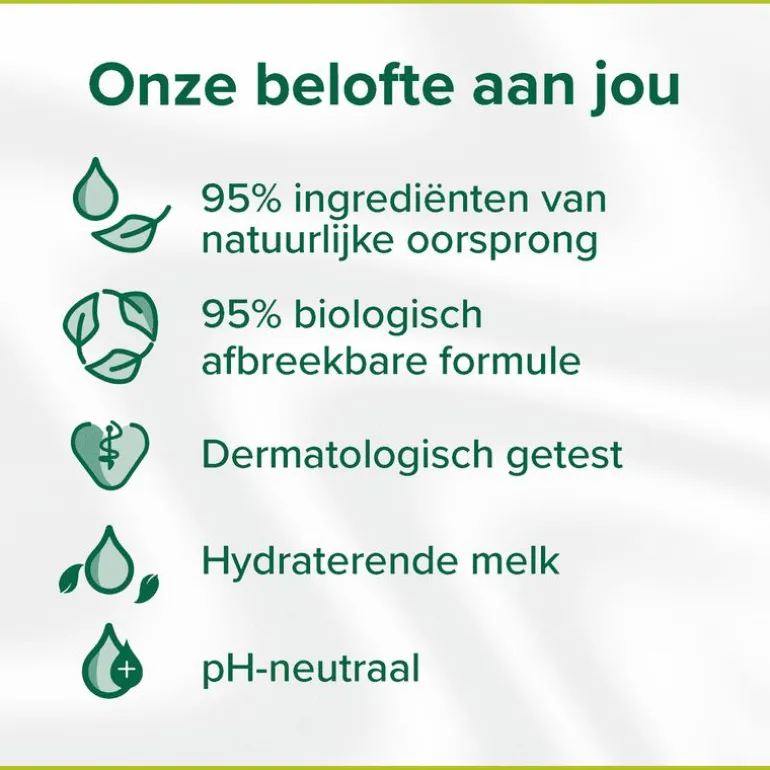 De douchecrème bevat niet alleen plantaardige melk, maar is ook gemaakt met ingrediënten van 95% natuurlijke oorsprong**. De bodywash heeft een voor 98% biologisch afbreekbare formule en zit in een recyclebare fles. De vegan douchecrème is ook dermatologisch getest.