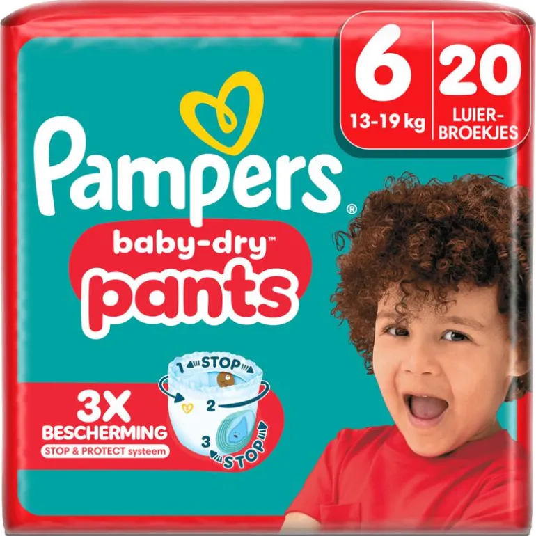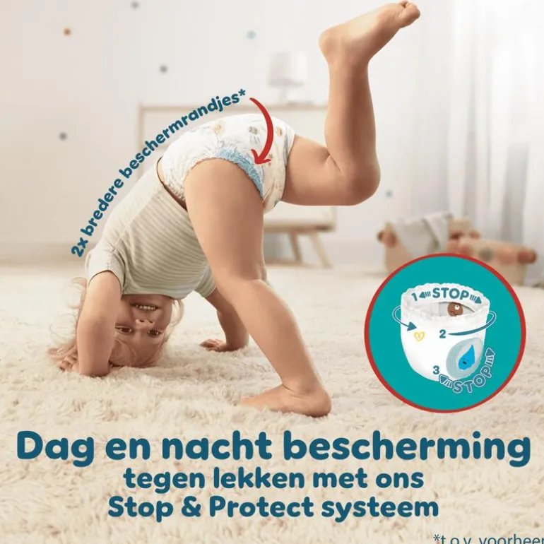 Als je baby actiever wordt, wil je een luierbroekje dat al zijn bewegingen kan bijhouden. Met hun revolutionaire Stop & Protect Systeem bieden Pampers Baby-Dry Pants luierbroekjes superieure bescherming rondom tegen lekken, in welke houding je baby zich ook bevindt – dag en nacht. Pampers Baby-Dry Pants luierbroekjes Stop & Protect Systeem heeft: 2x bredere* beschermrandjes die lekken rond de beentjes helpen voorkomen, een pocket om lekken aan de achterkant te helpen voorkomen, een 360° flexibele tailleband, die zich aan het lichaam van je baby aanpast terwijl hij beweegt en een superabsorberende kern die tot 12 uur bescherming biedt. Net als alle andere Pampers luierbroekjes zijn de Pampers Baby-Dry Pants luierbroekjes heel eenvoudig te verschonen, zelfs als je baby veel beweegt: je trekt ze in één beweging aan, scheurt de zijkanten open om ze uit te trekken, rolt ze op en gebruikt de plakstrip om ze weg te gooien.