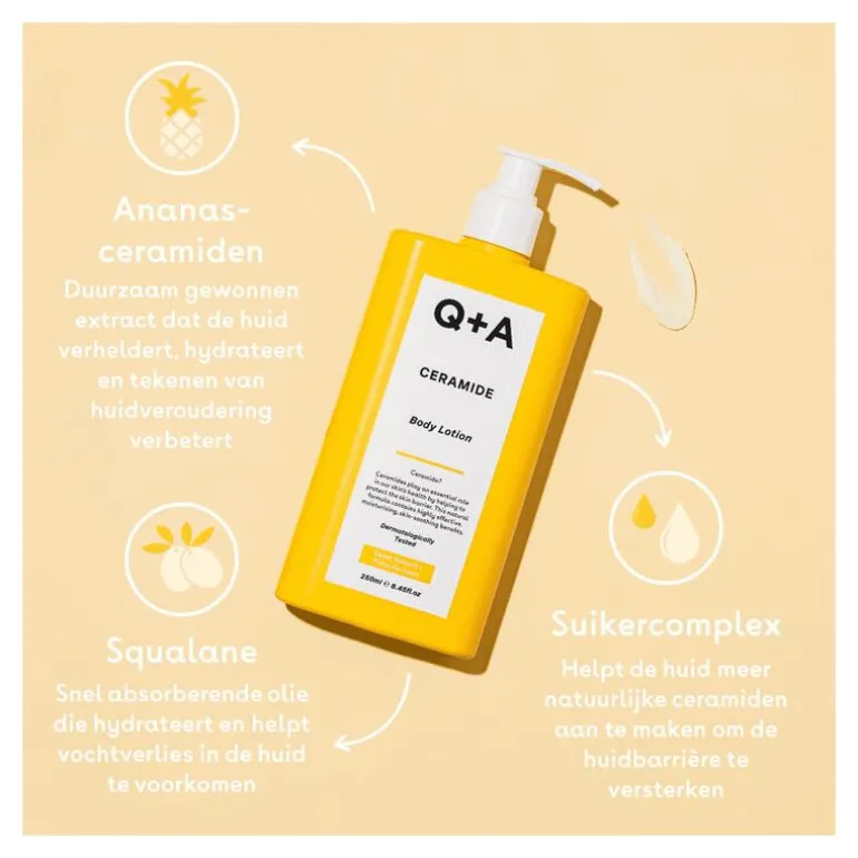 Q+A Ceramide body lotion voor ultieme voeding en diepe hydratatie. Deze Ceramide Body Lotion zit boordevol Squalaan, Ananas Ceramiden en een barrièrebeschermend Suikercomplex. Deze gel-crème absorbeert net zo snel als onze andere formules, waardoor de huid zijdezacht aanvoelt, maar biedt de diepe hydratatie net als die van een body butter.