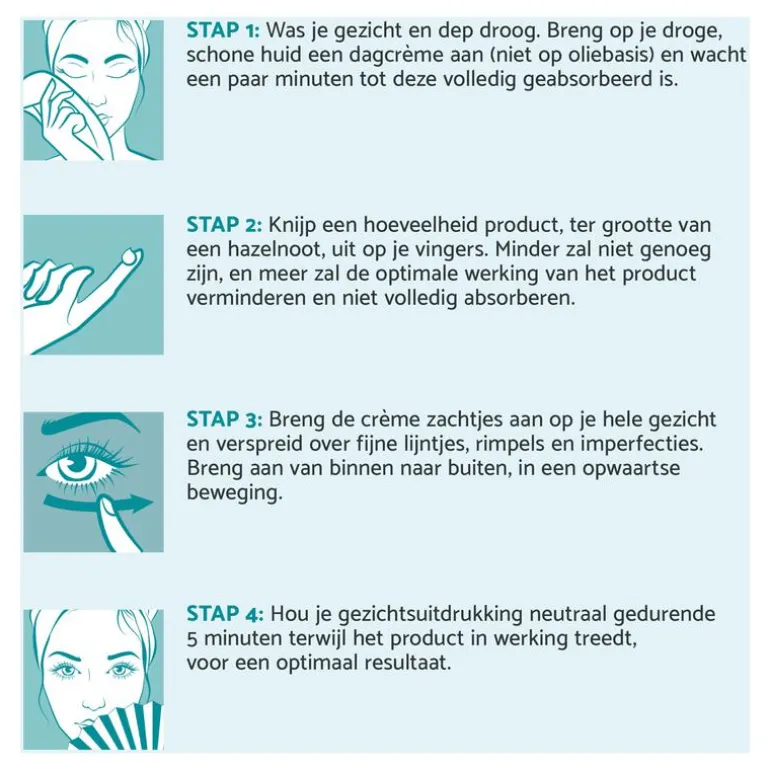 Stap 3: Verdeel de crème lichtjes over je gezicht en strijk uit over de lijntjes, rimpels en oneffenheden.