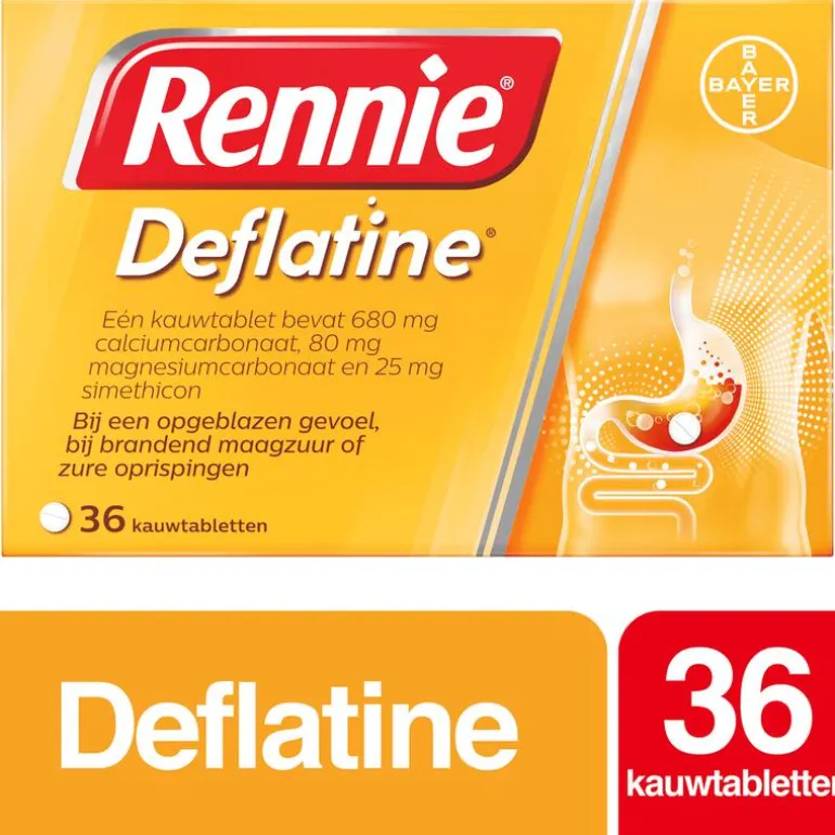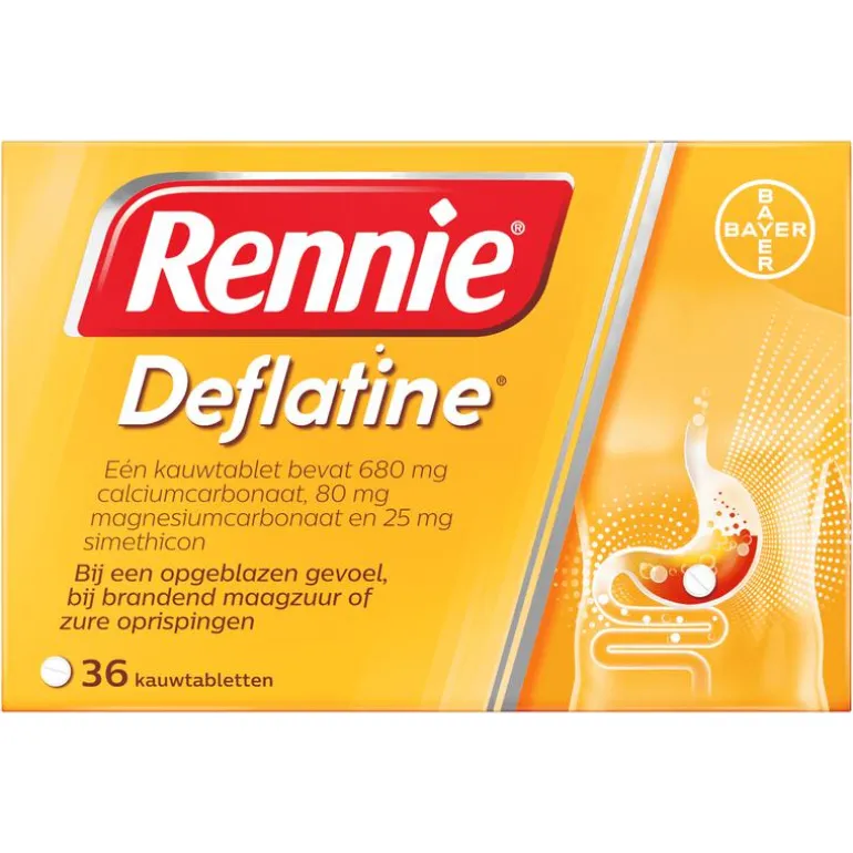 Rennie Deflatine bevat de werkzame stof simethicon, dat kleine gasbelletjes uit elkaar laat vallen in je maag en darmen. Hierdoor gaat het flatulentie tegen en neemt het gevoel van een opgeblazen buik af. Daarbovenop verlicht Rennie Deflatine ook brandend maagzuur binnen 2 minuten. Je maag is snel weer rustig zodat je weer van je dag of avond kunt genieten. Rennie is een maagzuurtablet en staat bekend als een maagzuurbinder. Dat betekent dat het overtollig maagzuur in je maag omzet in water en andere lichaamseigen stoffen. Zodra je last hebt van brandend maagzuur, eventueel samen met een opgeblazen buik of flatulentie, kun je 1 tot 2 kauwtabletten innemen.Rennie Deflatine is geschikt voor volwassenen en kinderen vanaf 12 jaar, maar kan ook door zwangere vrouwen gebruikt worden. Als je zwanger bent, raadpleeg dan wel je verloskundje of (huis)arts. Heb je geen last van winderigheid of een opgeblazen gevoel, dan kun je ook een gewone Rennie proberen, zoals de Suikervrije variant. Voor een dubbele werking is er Rennie Duo, die brandend maagzuur neutraliseert maar ook een beschermend laagje om de maaginhoud legt. Daardoor is de kans kleiner dat brandend maagzuur opnieuw in de slokdarm terecht komt.