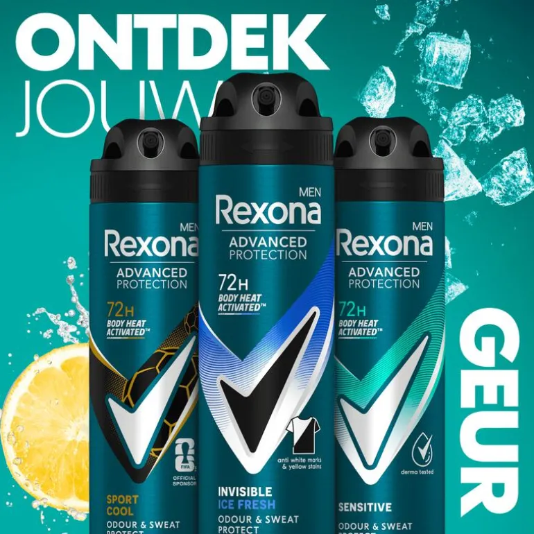 Rexona Men Advanced Protection Invisible Ice Fresh Anti-Transpirant Spray met Body Heat Activated Technologie beschermt tot 72 uur tegen zweet, lichaamsgeur en vlekken.