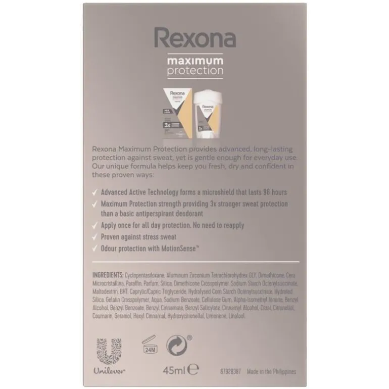 REXONA WOMEN MAXIMUM PROTECTION ACTIVE SHIELD ANTI-TRANSPIRANT DEODORANT CREAM STICK BIEDT 3X KEER MEER BESCHERMING DAN ONZE REGULIERE ANTI-TRANSPIRANT.• Rexona Women Maximum Protection Active Shield Anti-Transpirant Deo Stick• De deodorantcrème biedt tot 96 uur bescherming tegen zweet en geurtjes• Beschermt 3x meer dan onze reguliere anti-transpirant• De Maximum Protection anti-transpirant deodorant is dermatologisch getest• Deze deodorantstick is mild en geschikt voor dagelijks gebruik• Verleg je grenzen: Rexona deodorant geeft je vertrouwen om meer te bewegen